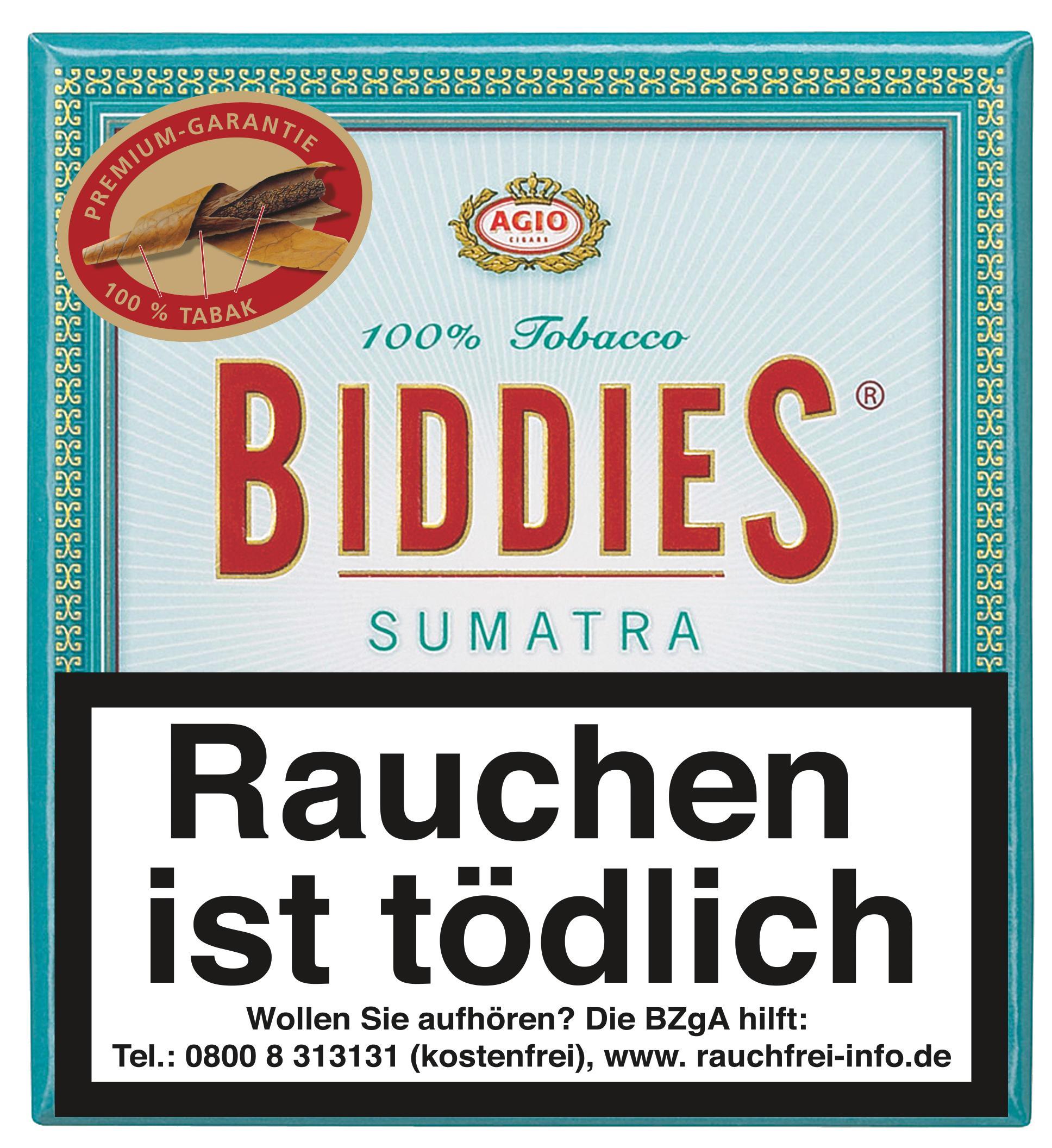 Agio Biddies Sumatra sind klassische, maschinell hergestellte Sumatra-Cigarillos mit einem natürlichen, leicht süßlich-würzigen Tabakgeschmack und moderater Stärke. Sie kombinieren elegante Form, 100 % Tabak-Qualität und gutes Preis-Leistungs-Verhältnis – ideal für all jene, die ein authentisch tabakbetontes, unkompliziertes Cigarillo-Erlebnis suchen.