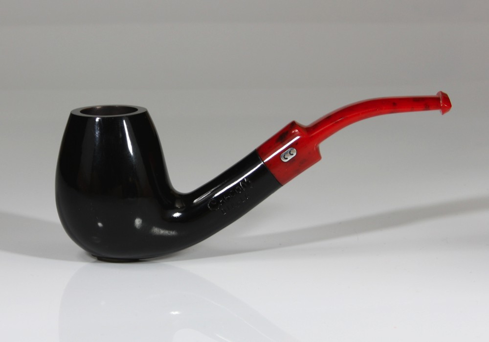 Schwarze Pfeife mit Mundstück aus rotem Acryl. Diese diabolische Pfeife ist seit Jahren ein begehrter Klassiker.