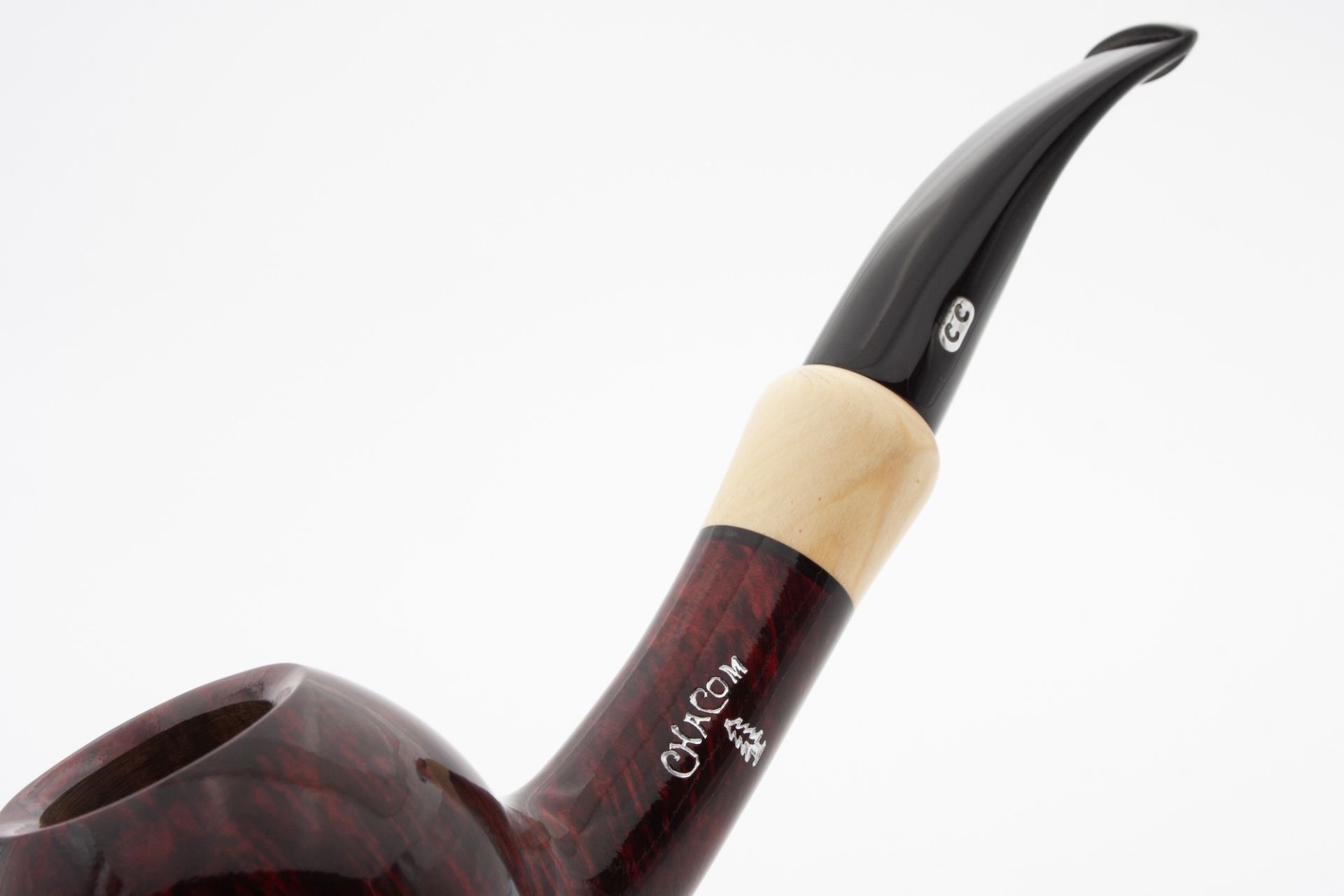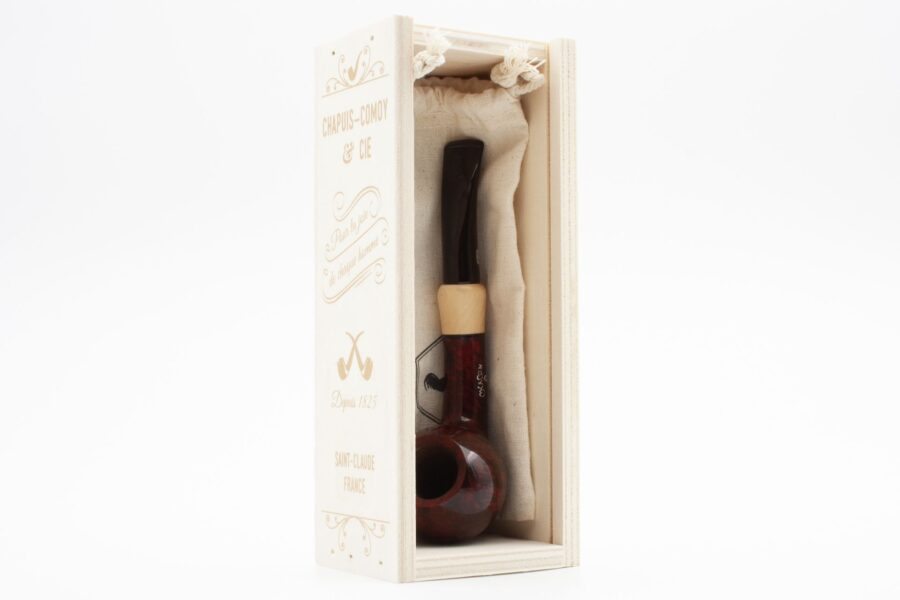 Die bordeauxfarbene Chacom Weihnachtspfeife wird durch eine Applikation aus Buchsbaumholz veredelt. Sie wird stilvoll in einer hochwertigen Holzschatulle präsentiert.