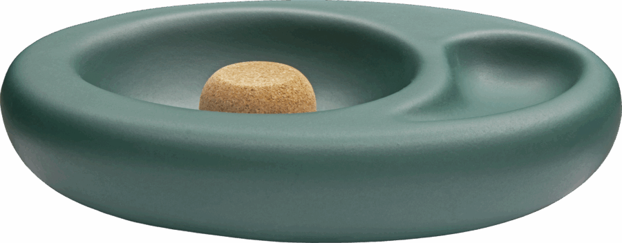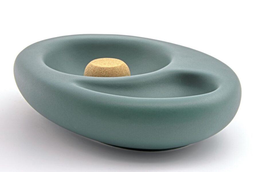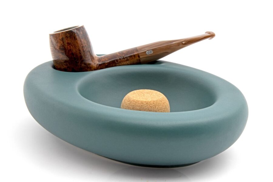 Dieser Pfeifenascher aus Keramik mit einer matt grünen Oberfläche verfügt über eine Ablage für eine Pfeife und einen halbkugelförmigen Korken, um den Pfeifenkopf zu leeren, ohne Schaden zu riskieren.