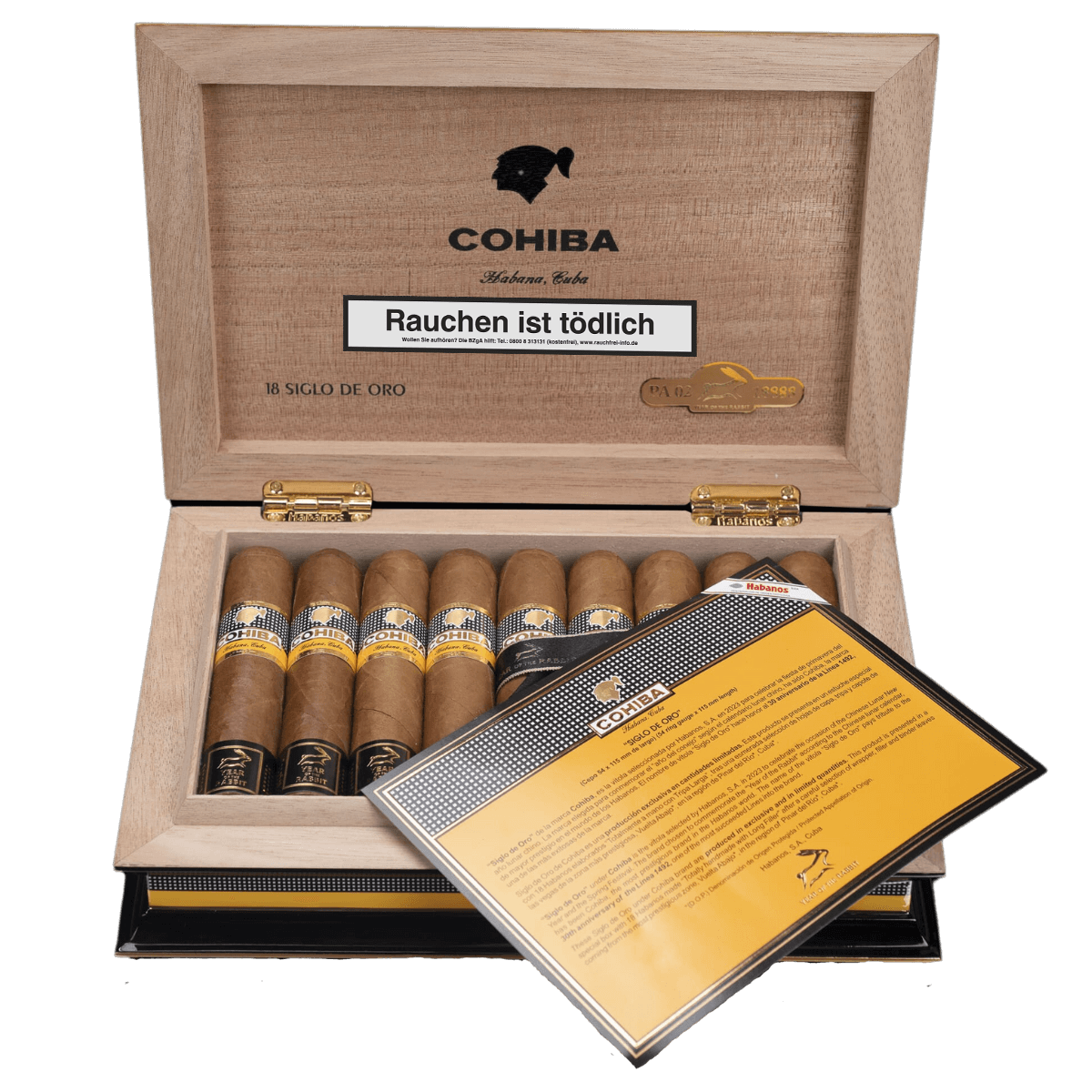 Die Cohiba Siglo de Oro „Year of the Rabbit“ ist eine hochwertige, limitierte kubanische Zigarre im Exitosos‑Format, die den kulturellen Anlass des chinesischen Neujahrs und das 30‑jährige Bestehen der legendären Siglo‑Linie würdigt. Sie kombiniert komplexe Aromatik, elegante Würze und traditionelle Cohiba‑Charakteristik in einer exklusiven Sonderedition mit hohem Sammlerwert.