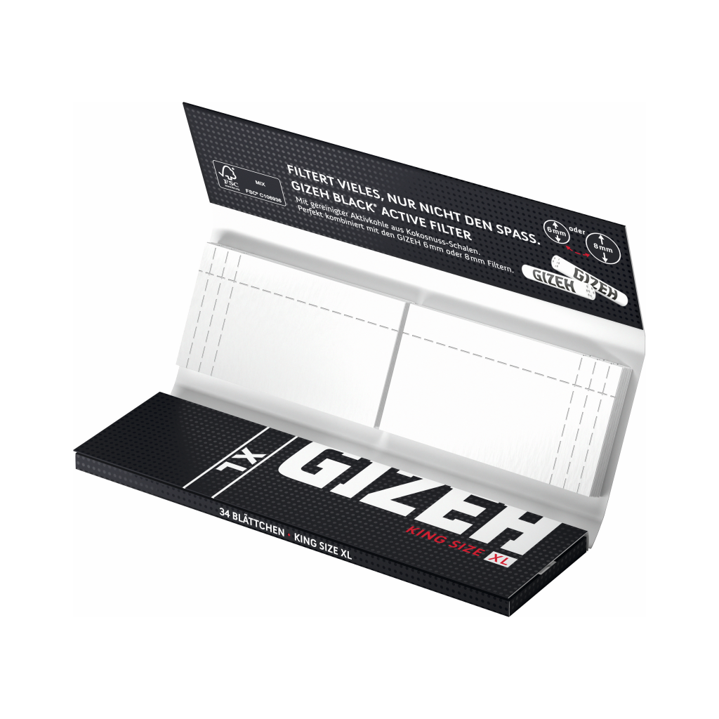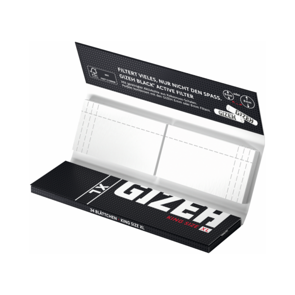 Die Gizeh Black King Size XL + Tips sind hochwertige Longpapers mit passenden Filtertips in einem praktischen Kombipack. Sie eignen sich zum Drehen von Zigaretten oder Kräutermischungen und bieten durch ihr extra dünnes Papier ein besonders gleichmäßiges und langsames Abbrennen.