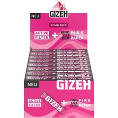 Das Gizeh Pink King Size Slim + Active Filter ist ein praktisches 2-in-1 Kombipack aus langen Drehpapieren (Papers) und Aktivkohlefiltern. Es richtet sich an Personen, die alles zum Drehen in einer Packung haben möchten.