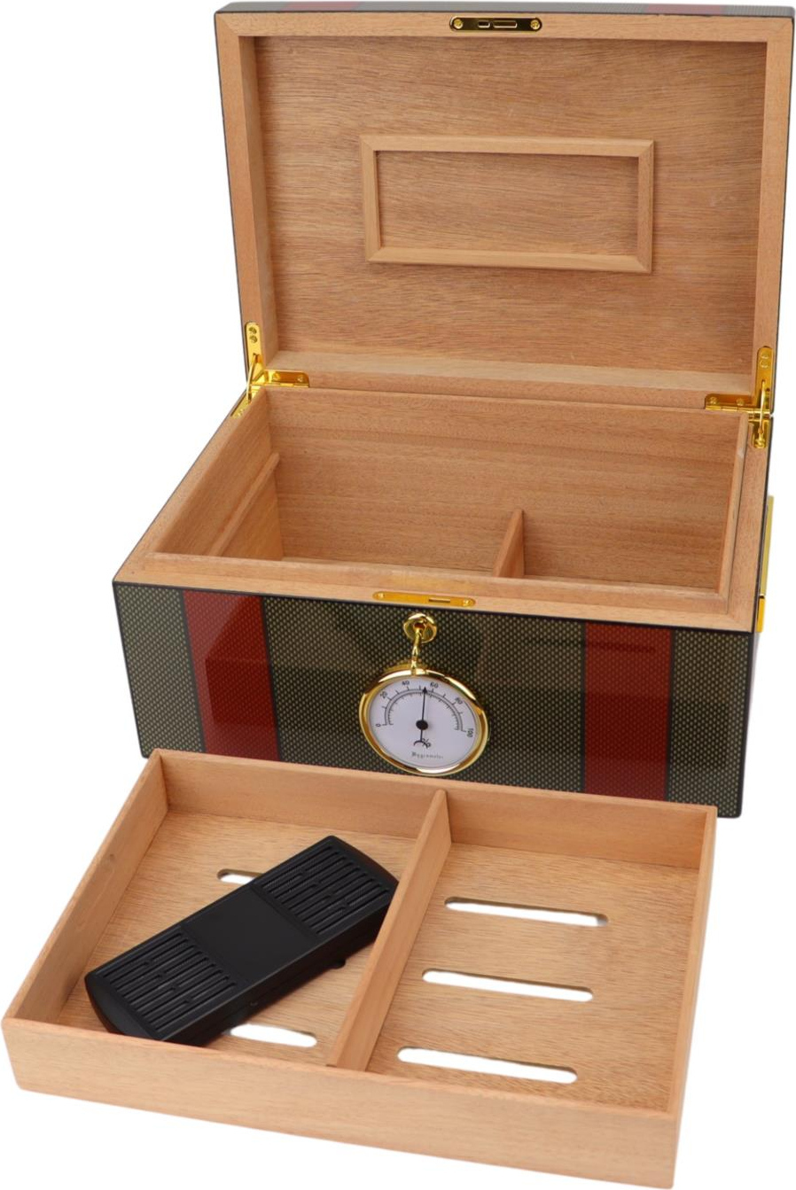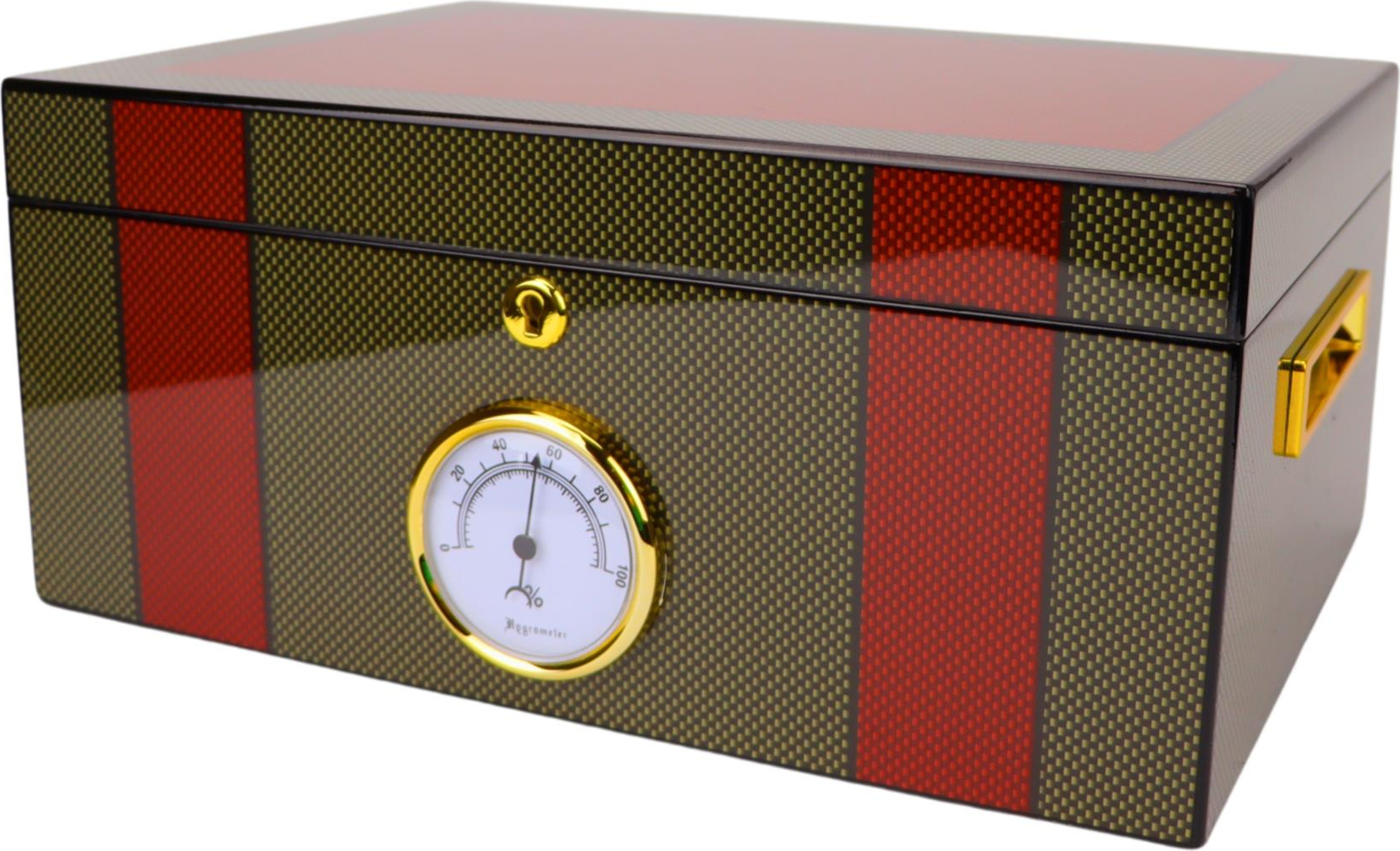 Dieser auffällige Humidor im glänzenden Carbonfinish von Carbon Finish Holzoptik vereint modernes, farbenfrohes Design mit professioneller Funktionalität. Mit Platz für 30–40 Zigarren ist er ideal für Sammler, die Stil, Sicherheit und Ordnung schätzen.