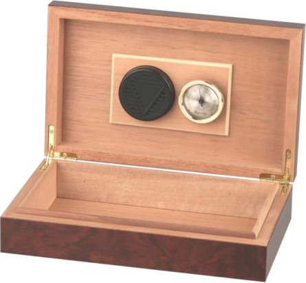 Das Bild auf dem Deckel verrät es: In diesem Humidor finden Sie einen sicheren Aufbewahrungsort für Ihre Cigarren! Bis zu 10 Ihrer Lieblinge kann diese kleine Kiste beherbergen, die mit Hygrometer und einem Acrylpolymer-Humidifer ausgestattet ist.