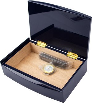 Der Humidor in elegantem dunkelblauem Hochglanz-Finish ist die perfekte Kombination aus Stil und Funktionalität. Mit Platz für ca. 10 Zigarren eignet er sich ideal für Sammler oder Gelegenheitsraucher, die ihre Zigarren optimal aufbewahren möchten.