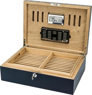 Die dunkelblaue, matte Lackierung verleiht dem Humidor eine edle, moderne Optik. Die hochwertige Verarbeitung sorgt für Stabilität und Langlebigkeit, während die pflegeleichte Oberfläche das Reinigen erleichtert.