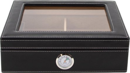 Humidor Lederoptik schwarz mit weißen Nähten – Glasdeckel, für ca. 20 Zigarren