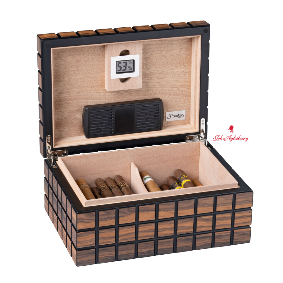 Der PASSATORE Humidor Rippen in edler Kombination aus Schwarz und Makassar matt ist die perfekte Aufbewahrungslösung für hochwertige Zigarren. Durch seine klassische, zeitlose Optik und die hochwertige Verarbeitung ist er gleichermaßen ein stilvolles Wohnaccessoire und funktionales Accessoire für Zigarrenliebhaber.
