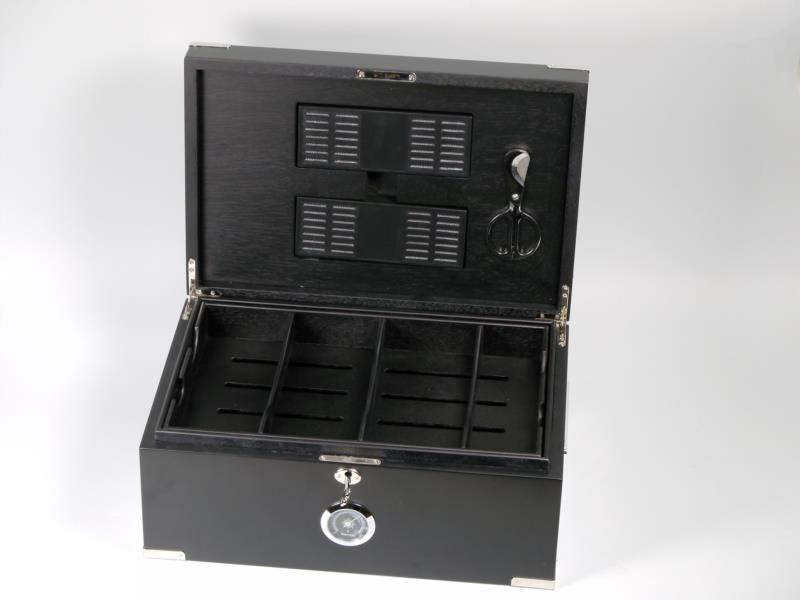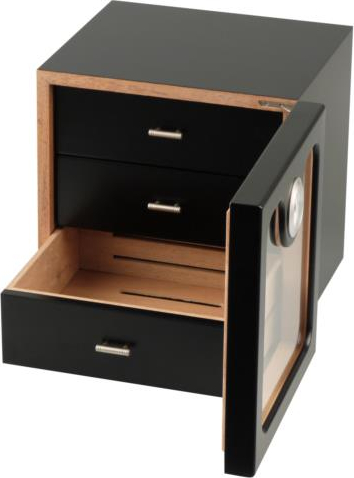 Humidor Schrank schwarz Acrylscheibe für ca. 50 Cigarren H 24.5 x B 24 x T 24cm, mit 3 Schubladen Hygrometer und 3 Acrylpolymer- Humidifern ARTIKELHIGHLIGHTS – für ca. 50 Cigarren – Außenmaße: H 24,5 x B 24 x T 24 cm – Innenmaße: H 21,5 x B 21,5 x T 21,5 cm – 3 Passatore Acrylpolymer-Humidifer – Hygrometer – 3 Schubladen