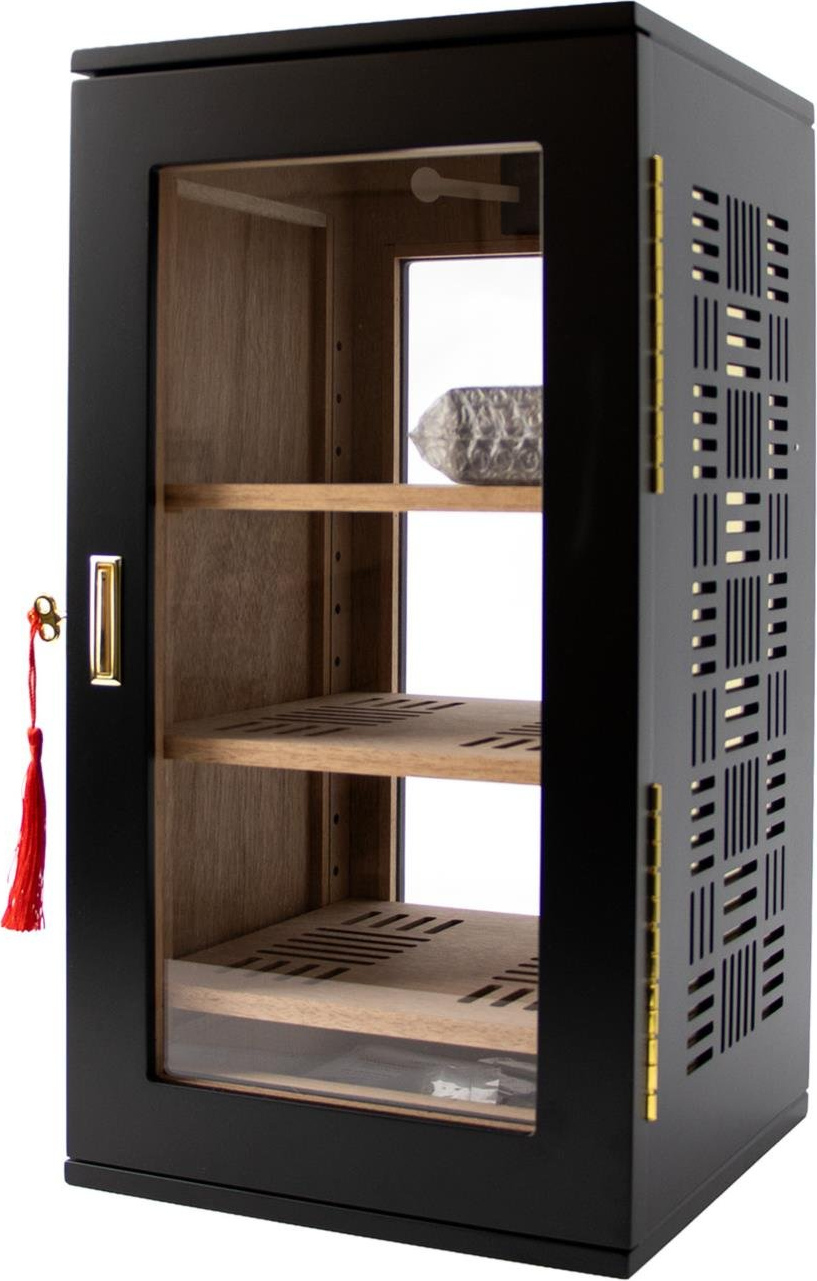Die matt-schwarze Lackierung kombiniert mit Acrylfront und -rückseite sowie seitlichem Dekor verleiht dem Humidor ein modernes, stilvolles Erscheinungsbild. Die transparenten Flächen ermöglichen jederzeit einen Blick auf die Zigarren, ohne den Schrank öffnen zu müssen.