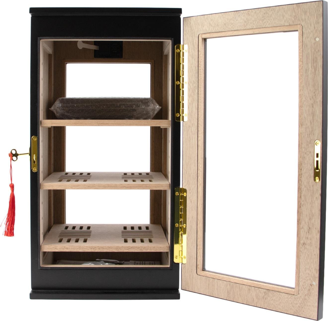 Der Innenraum verfügt über drei Böden, die eine geordnete Lagerung der Zigarren ermöglichen. So können unterschiedliche Formate oder Sorten getrennt aufbewahrt werden, während Aroma und Frische erhalten bleiben.