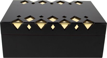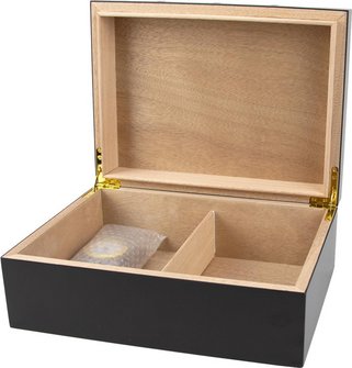Die matt-schwarze Oberfläche mit dezentem goldfarbenem Dekor verleiht dem Humidor ein edles, modernes Erscheinungsbild. Die hochwertige Verarbeitung sorgt für Langlebigkeit, während das Finish pflegeleicht ist.