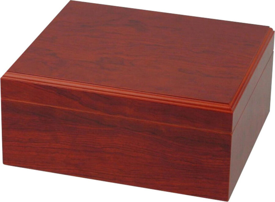Der schlichte Humidor hat eine Rosenholzoptik und ist mit fast allem