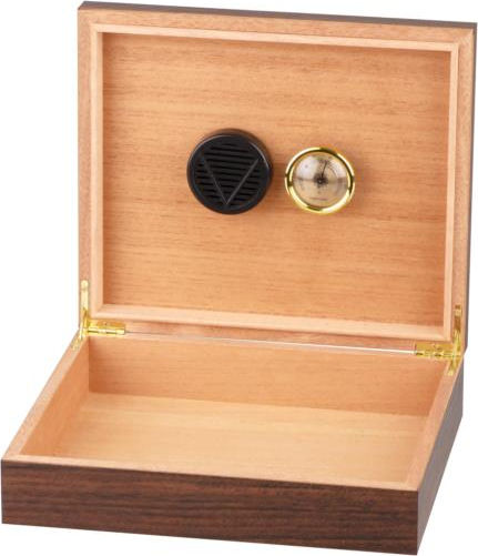 Artikelhighlights – für ca. 15-20 Cigarren – Außenmaße: H 6,5 x B 26 x T 22 cm – Innenmaße: H 3,5 x B 24 x T 20 cm – Acrylpolymer-Befeuchtungssystem