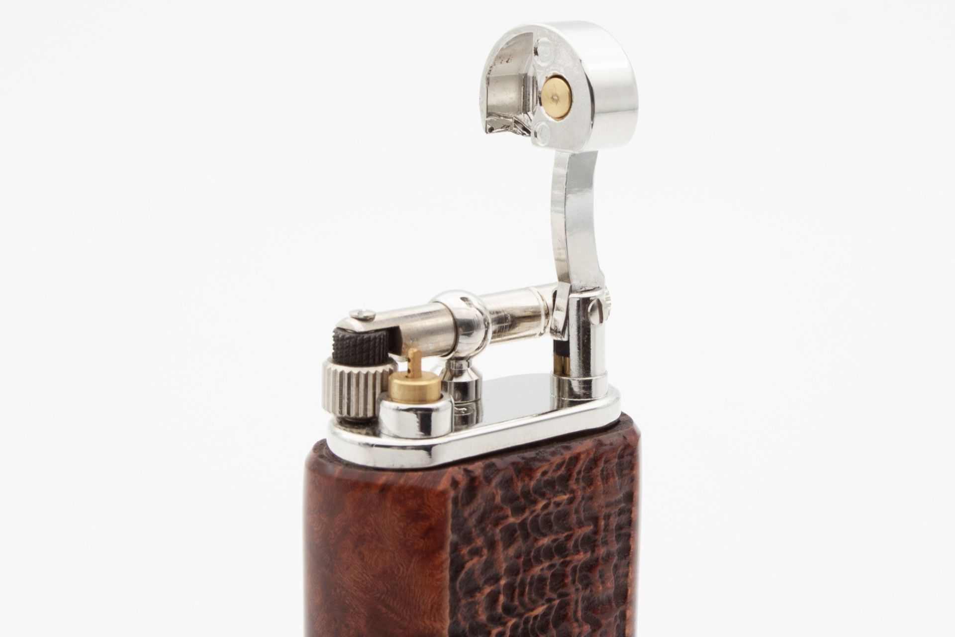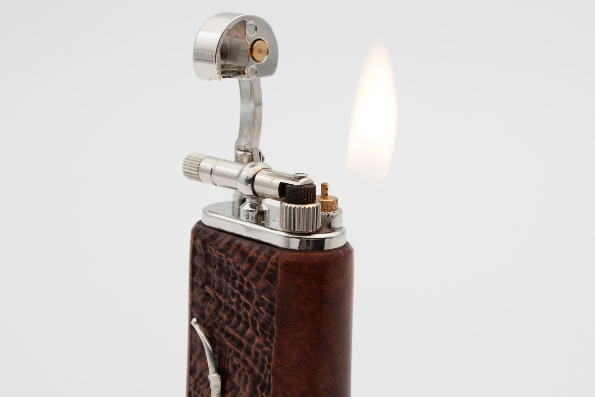 Das Sonnen- und Pfeifenemblem besteht aus echtem Sterling-Silber. Der Feuerzeugkörper selbst stammt aus der Produktion der in Tokio ansässigen Firma Pearl und verfügt über einen massiven Messingtank mit 4 Gramm Gaskapazität.