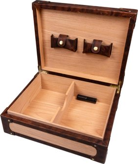Der Innenraum ist mit Holz ausgekleidet und verfügt über eine praktische Trennleiste, die eine geordnete Lagerung der Zigarren ermöglicht. Zusätzlich sind zwei Lederfächer integriert, die Platz für Zubehör wie Cutter oder Feuerzeug bieten. So bleiben Ihre Utensilien stilvoll organisiert.