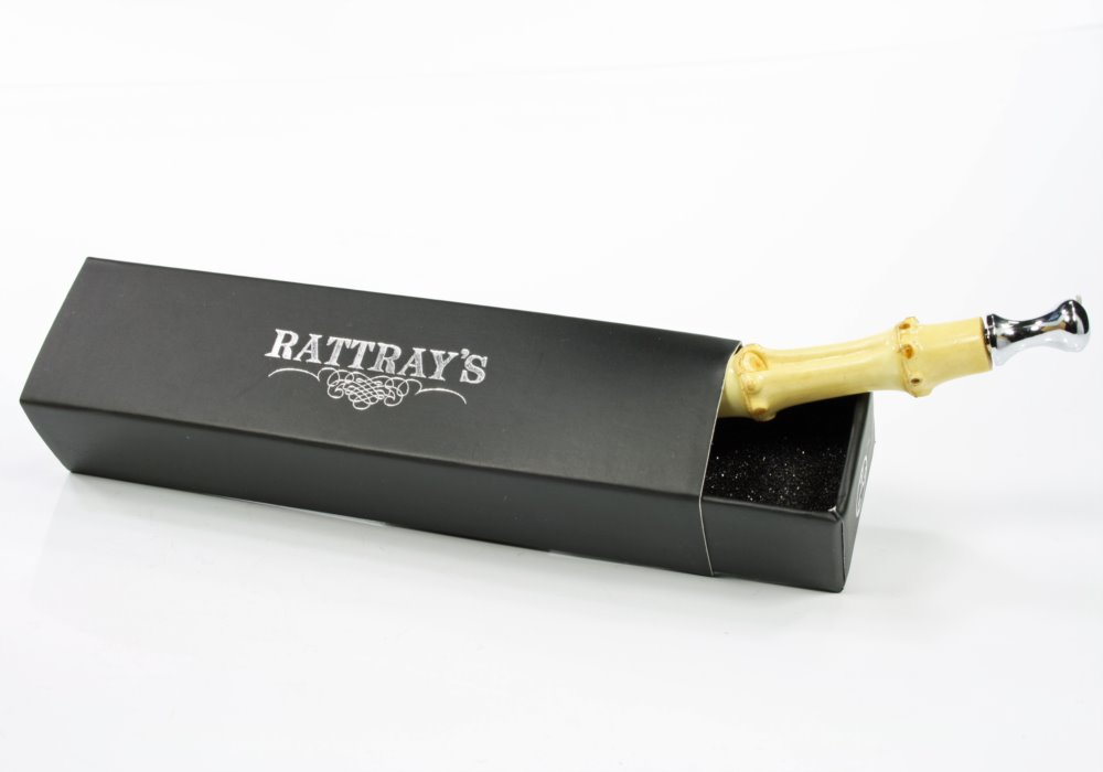 Formschöner Stopfer aus dunklem Bambus mit extra langem Dorn und leicht gewölbter Stopffläche.