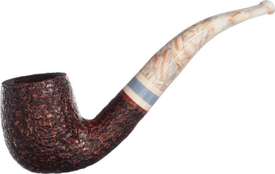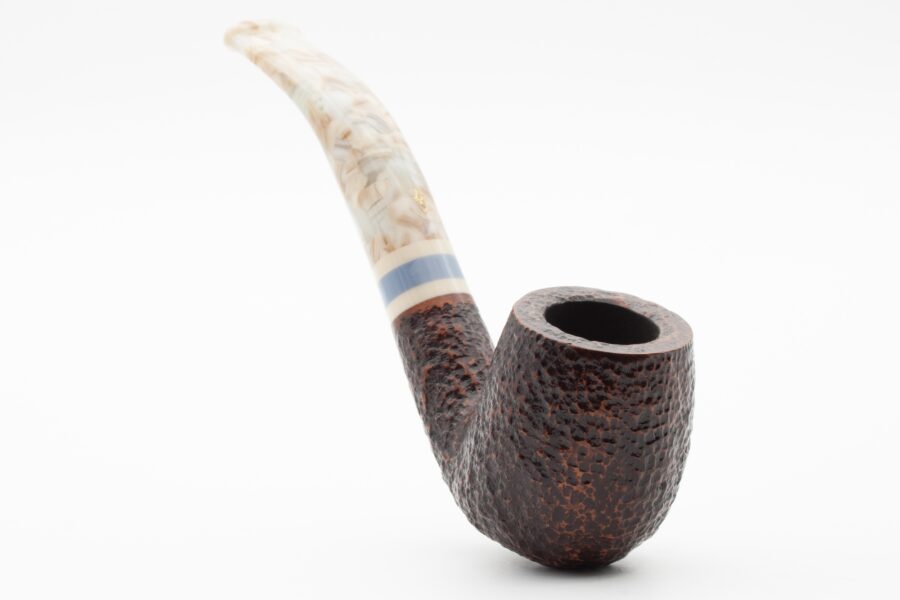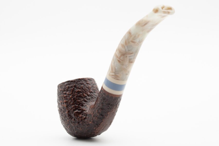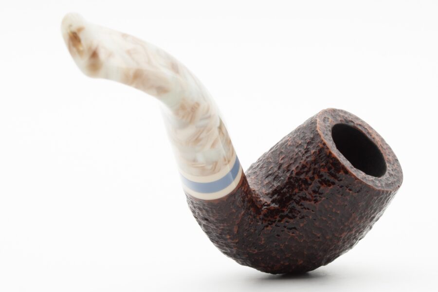 Die Pfeife verfügt über ein gemustertes Acrylmundstück mit Farbnuancen von Beige bis Grau. Ein pudrig-blauer Acrylring in passendem Farbton, eingefasst von zwei schmaleren Ringen, harmoniert perfekt mit dem Mundstück.
