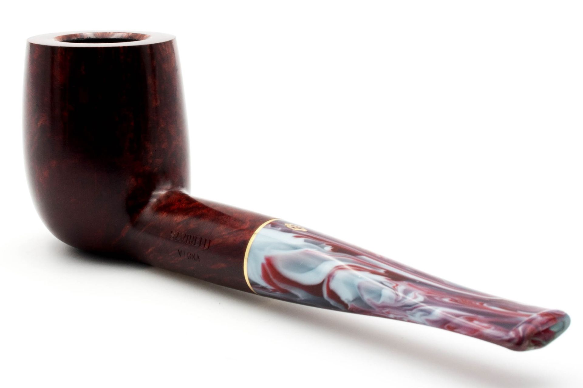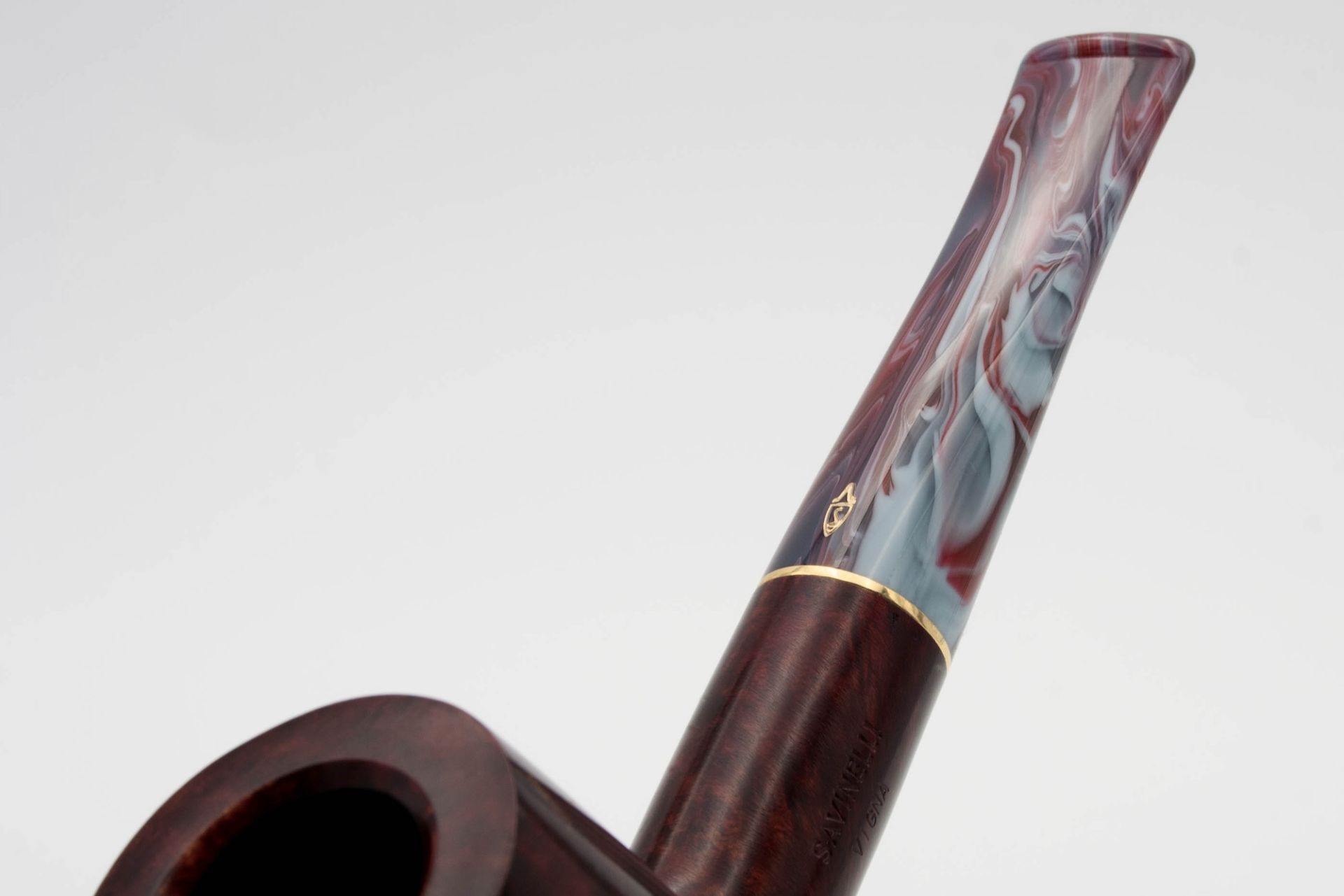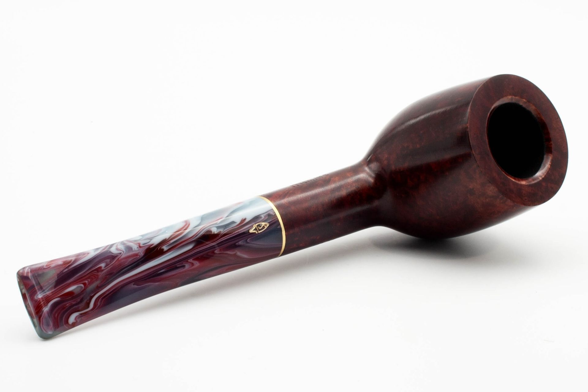 Dieses enthält Farbwirbel von rot über bordeaux bis hin zu dunkelblau. Ein schlanker goldfarbener Ring verleiht der Pfeife Klasse und Eleganz.