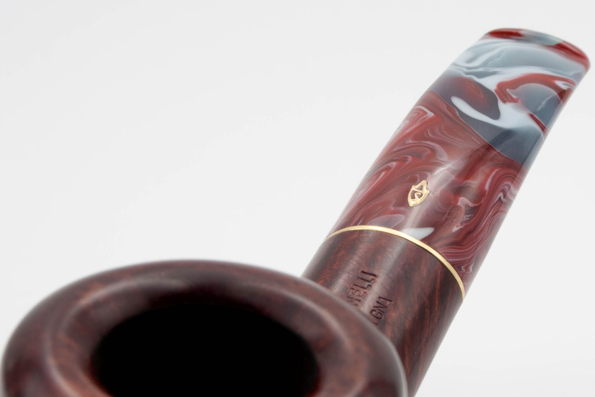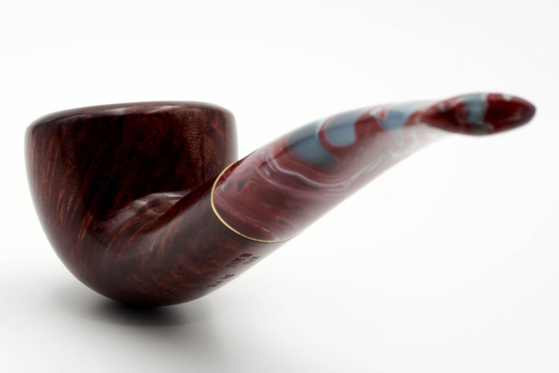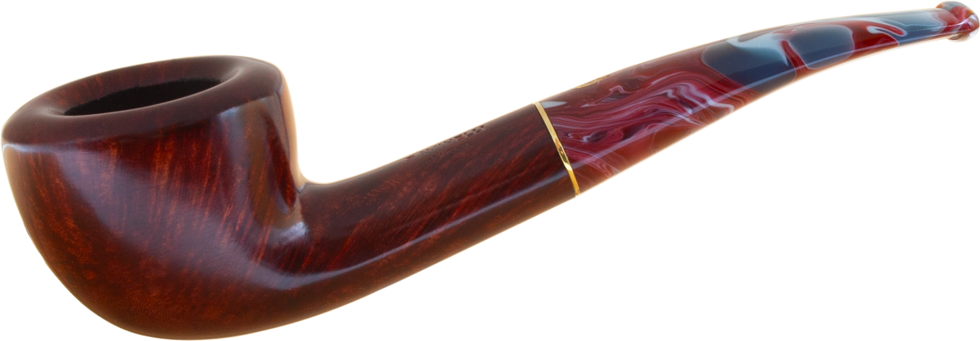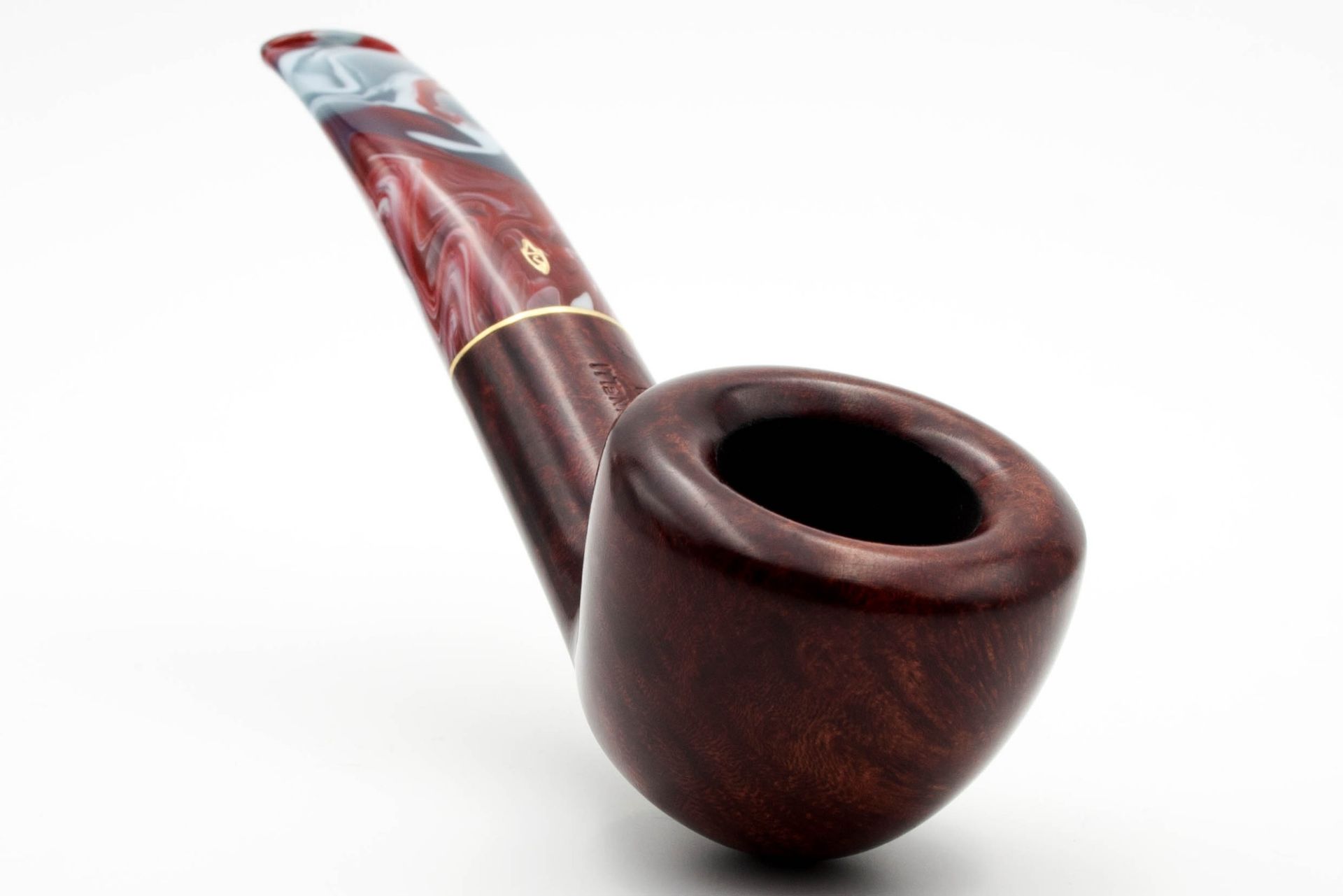 Dieses enthält Farbwirbel von rot über bordeaux bis hin zu dunkelblau. Ein schlanker goldfarbener Ring verleiht der Pfeife Klasse und Eleganz.