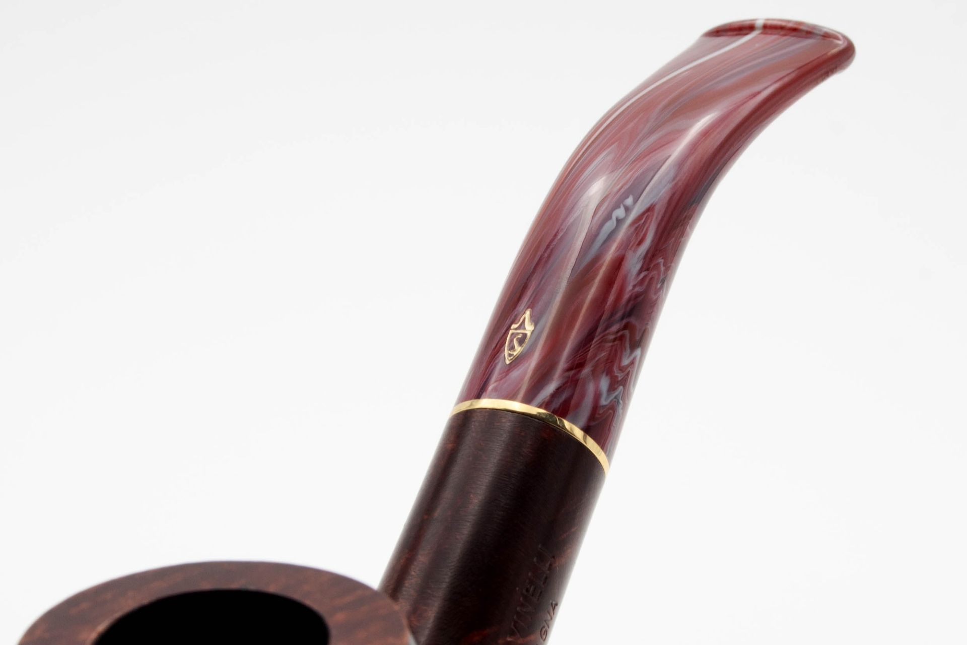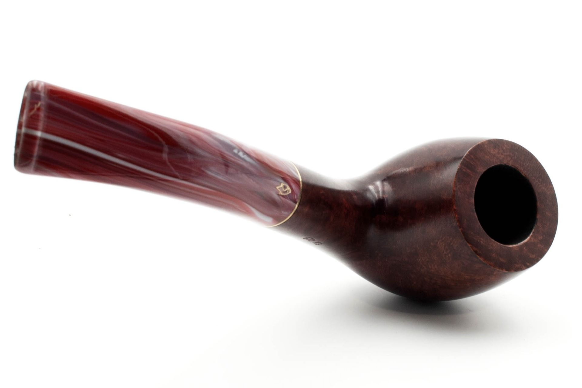 Dieses enthält Farbwirbel von rot über bordeaux bis hin zu dunkelblau. Ein schlanker goldfarbener Ring verleiht der Pfeife Klasse und Eleganz.