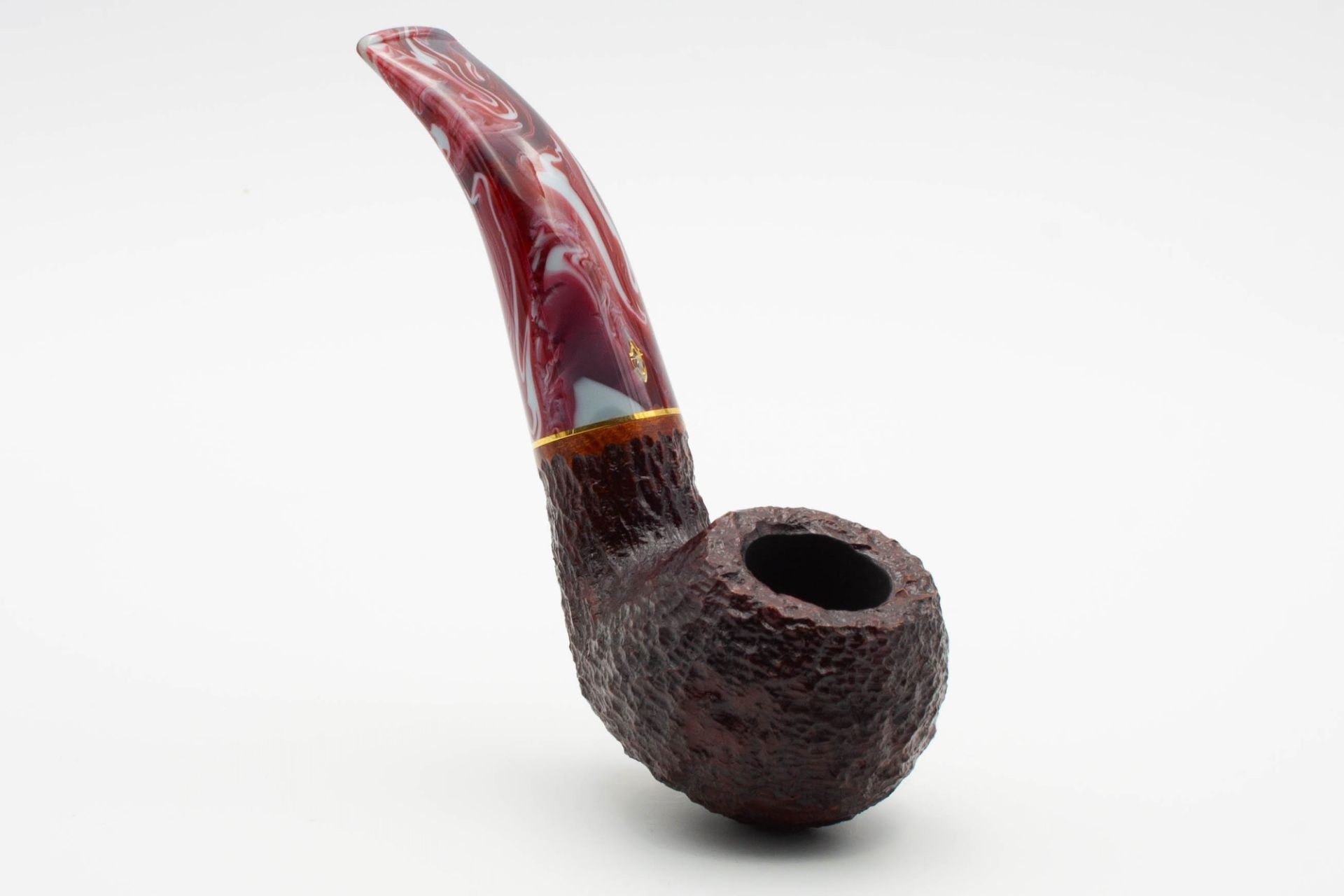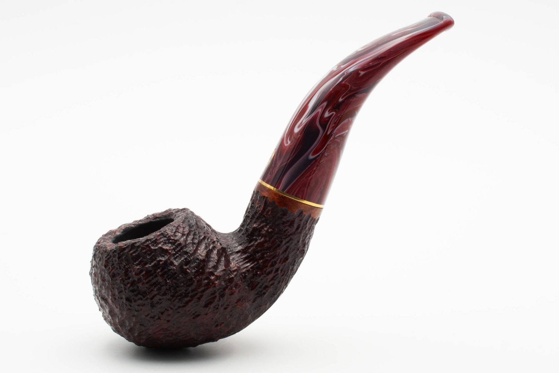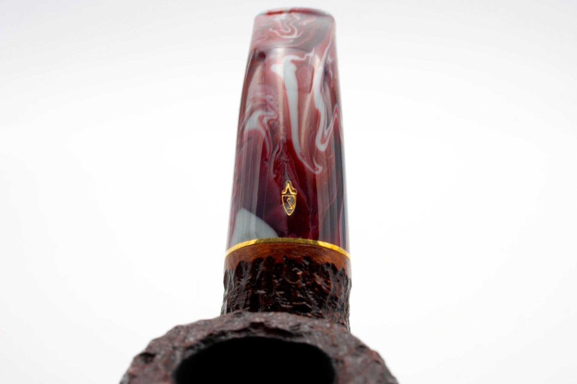 Dieses enthält Farbwirbel von rot über bordeaux bis hin zu dunkelblau. Ein schlanker goldfarbener Ring verleiht der Pfeife Klasse und Eleganz.