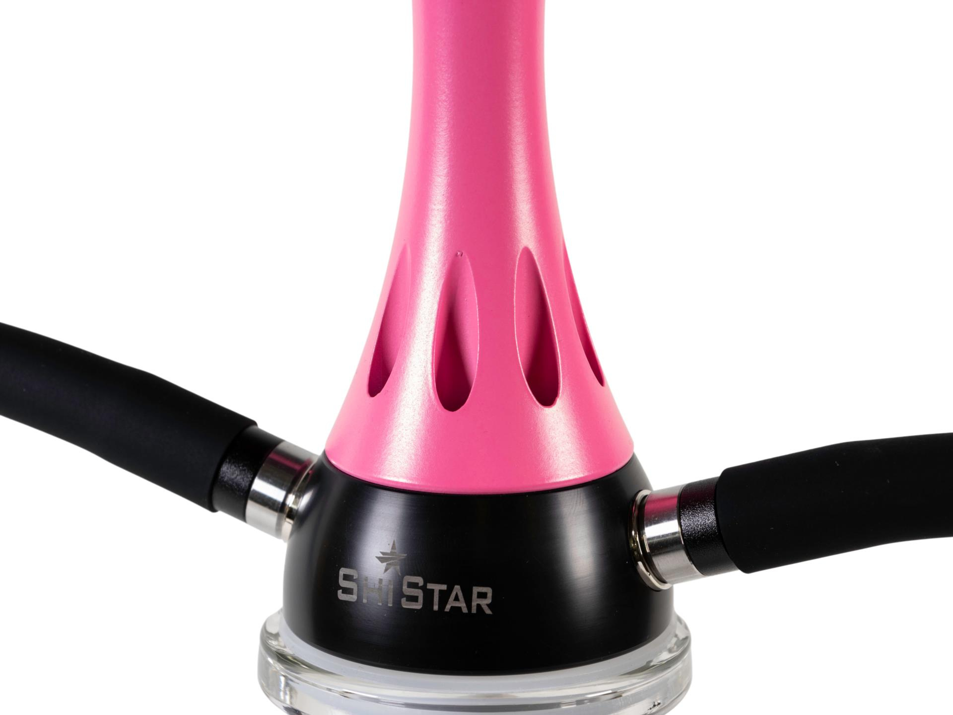 Die Shisha verfügt über eine massive, stabile Glas-Bowl, die für einen sicheren Stand sorgt. Die Rauchsäule ist in Pink gehalten und hebt sich farblich vom transparenten Glas ab – ein echter Blickfang.