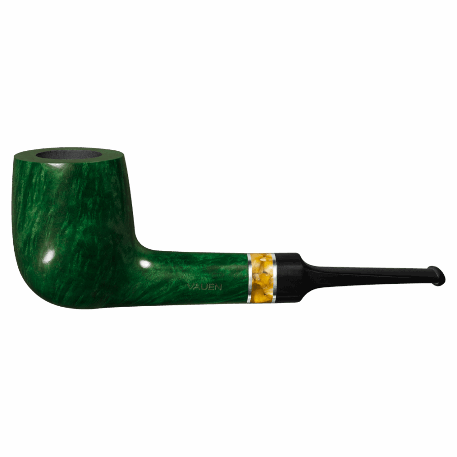 Die grüne samtmatte, von Hand gewachste Oberfläche harmoniert perfekt mit dem bernsteinfarbenen Ring.