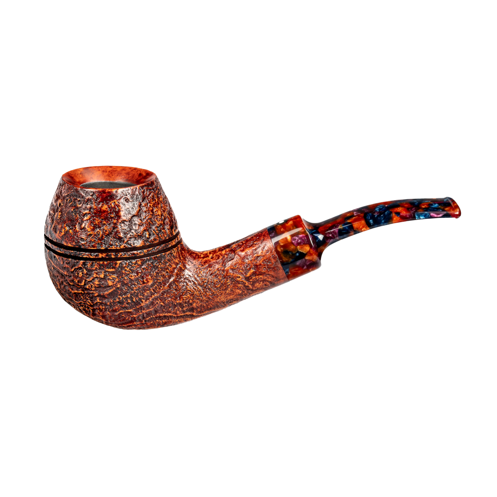 • Sandgestrahlte Briaroberfläche: Der sandgestrahlte Finish-Look verleiht der Pfeife eine warme, leicht strukturierte Oberfläche in einem dunkelbraunen Ton, der hervorragend mit den farbigen Akzenten des Mundstücks harmoniert.