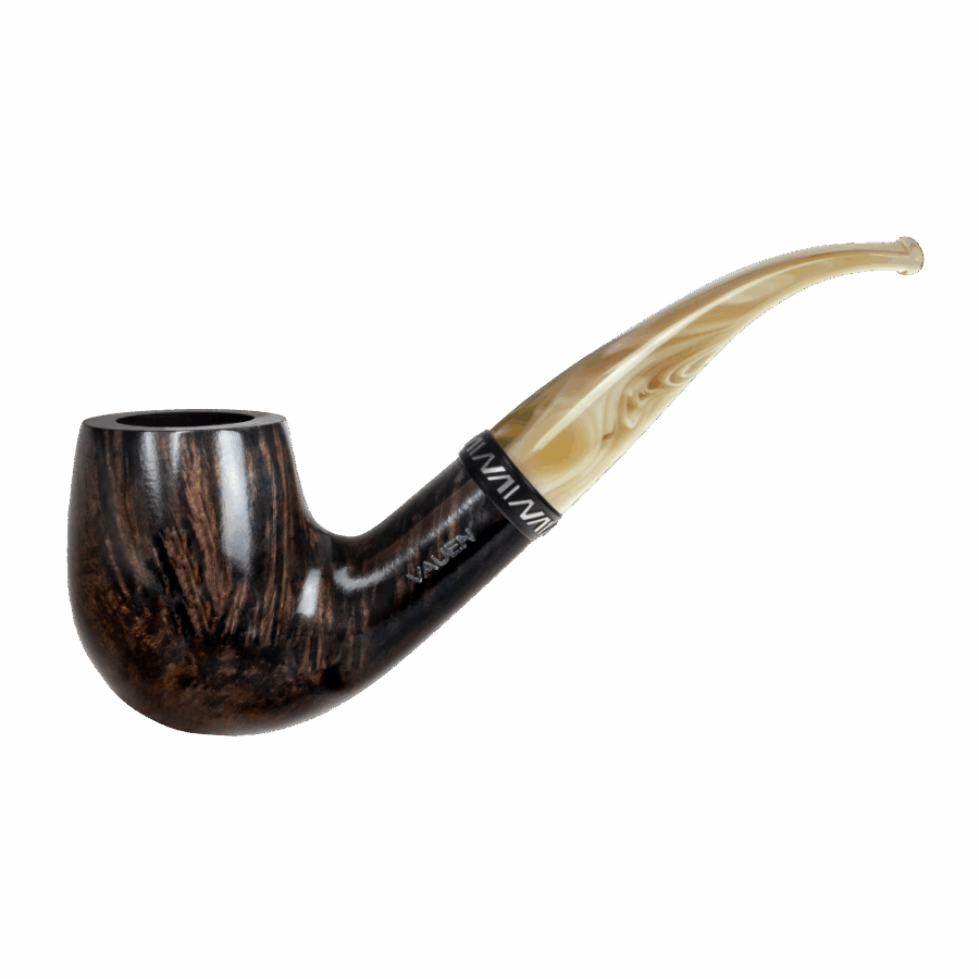 Ein schwarz-matter Ring mit silbernen Relief-Lettern „V“ und „N“, die als bedeutendes Element der Entstehungsgeschichte der Marke VAUEN stehen. Das Mundstück in Hornoptik und der dunkelbraune Pfeifenkopf erinnern an die typischen Wikinger-Trinkhörner.