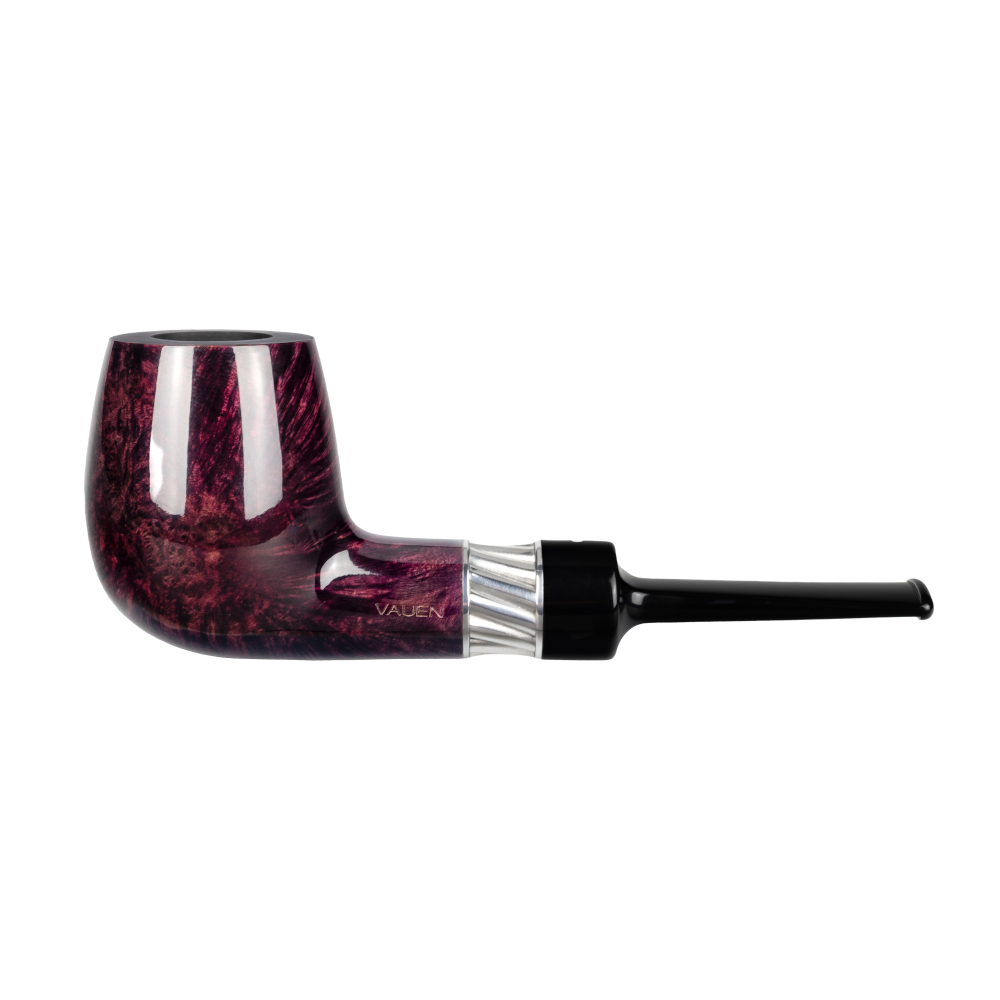 Die VAUEN Mito ist eine modernde, optisch markante Pfeifenserie, die vor allem durch ihren polierten Aubergine‑Ton und einen raffiniert gestalteten Silberring auffällt. Dieser Ring ist leicht gedreht/gezwirbelt verarbeitet und hebt sich elegant vom dunklen Holz ab, was der Serie einen stilvollen, edlen Charakter verleiht.