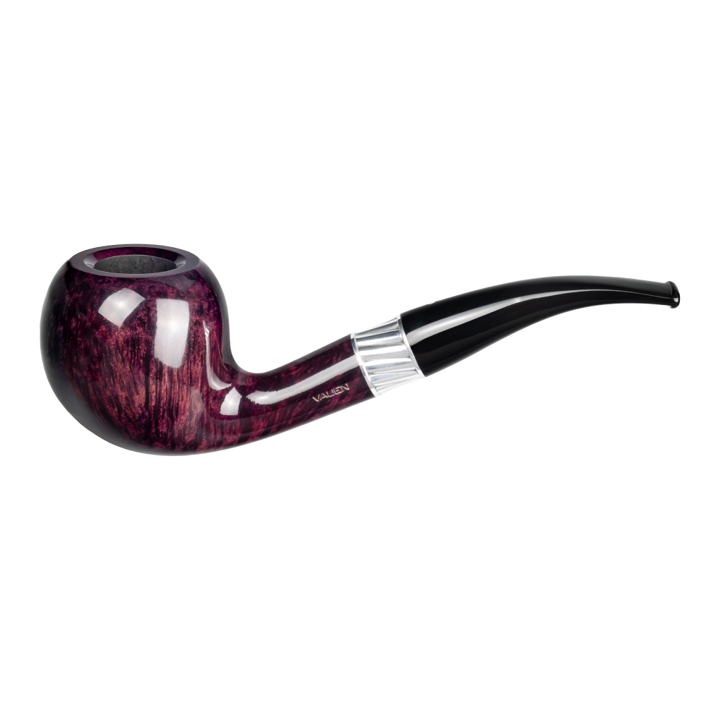 Die VAUEN Mito ist eine modernde, optisch markante Pfeifenserie, die vor allem durch ihren polierten Aubergine‑Ton und einen raffiniert gestalteten Silberring auffällt. Dieser Ring ist leicht gedreht/gezwirbelt verarbeitet und hebt sich elegant vom dunklen Holz ab, was der Serie einen stilvollen, edlen Charakter verleiht.