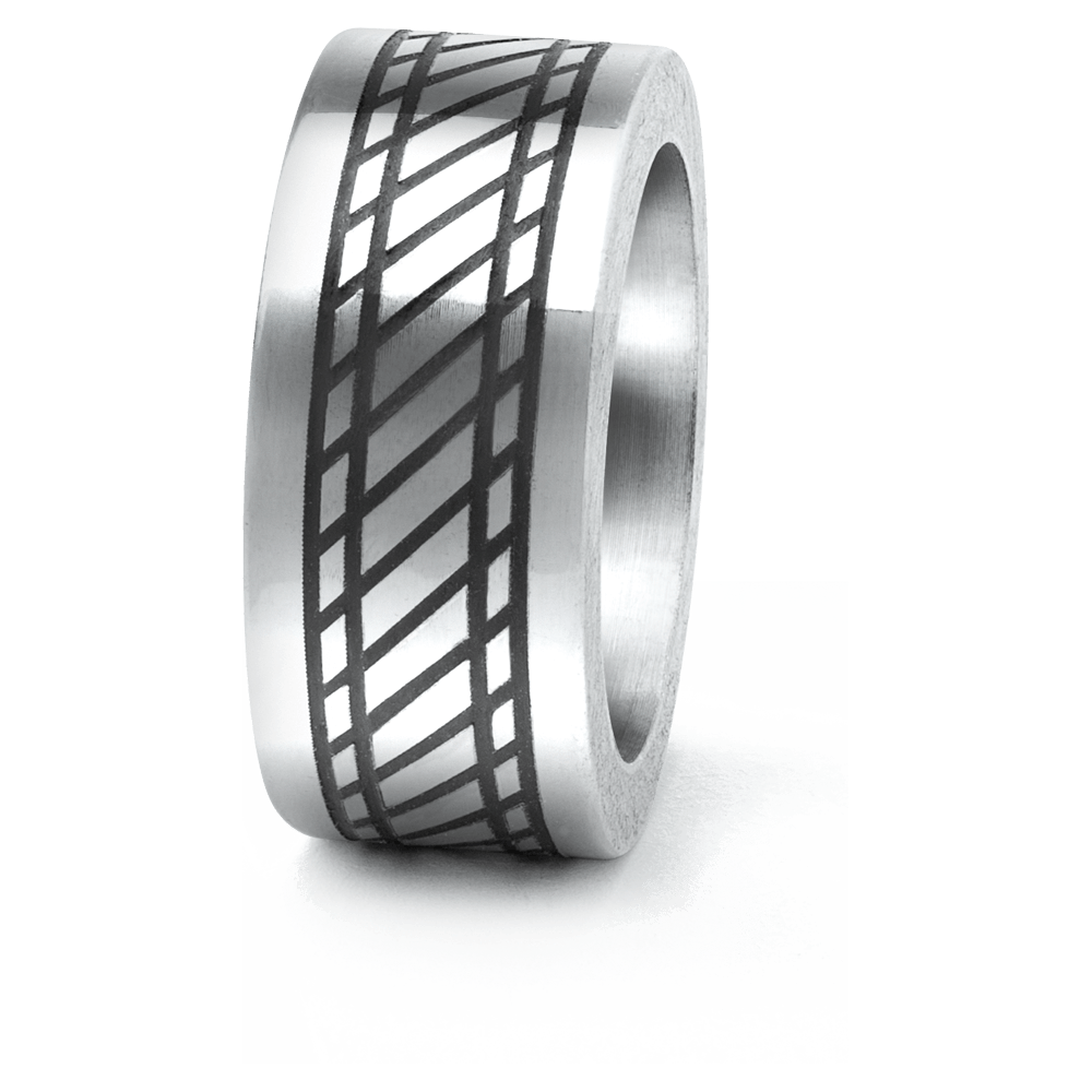 silberfarbenen Ring, dessen Linienmuster von Hand graviert wurde. Die