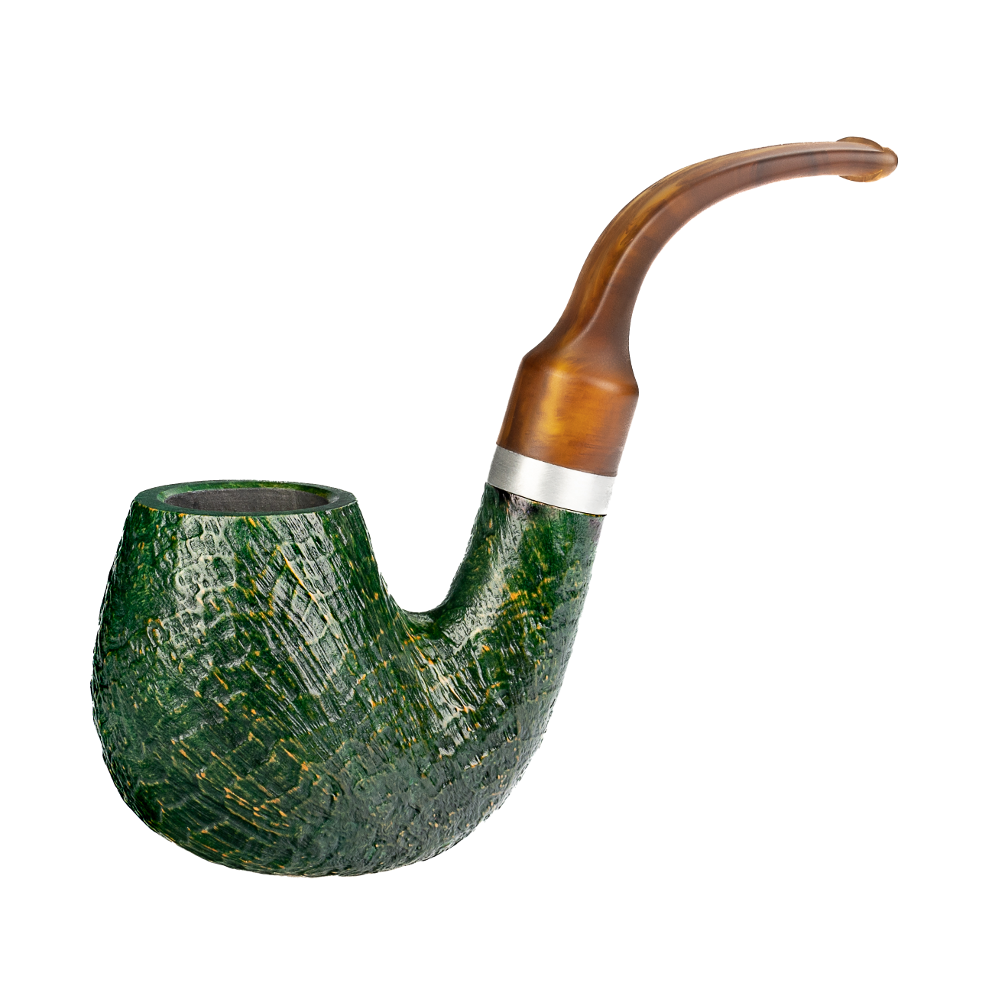 • Korpus aus Bruyèreholz (Briar) mit sandgestrahlter, dunkelgrüner Oberfläche, die durch mehrere Arbeitsschritte in einen Vintage‑Look gebracht wird. Diese Struktur lässt die Maserung lebendig wirken und sorgt für eine fühlbare Textur in der Hand.