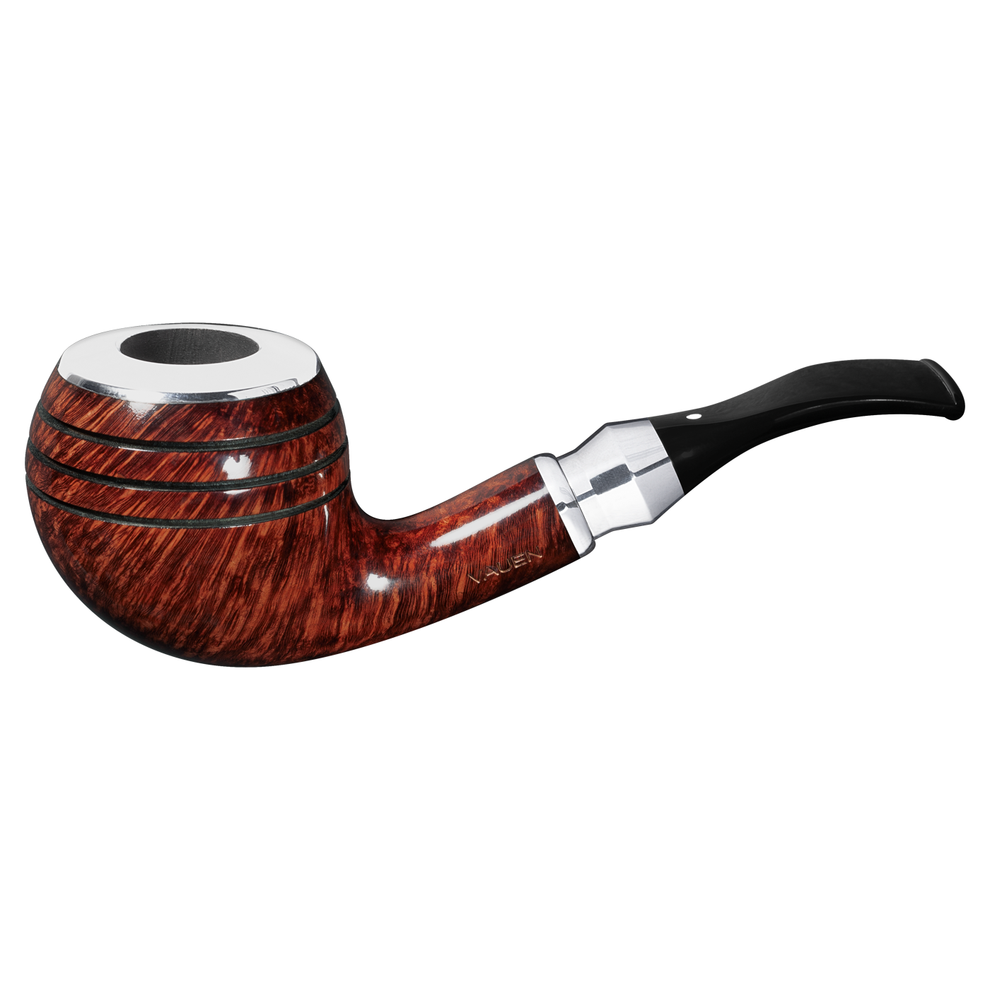 VAUEN Shine – traditionelles Bruyère‑Material trifft polierte Metallakzente, schwarze Acryl‑Mundstücke und klassische Formen. Stilsicher, angenehm zu rauchen und durch den Metallkopf‑Ring leichter sauber zu halten – ein eleganter Alltags‑Begleiter für Pfeifenliebhaber.