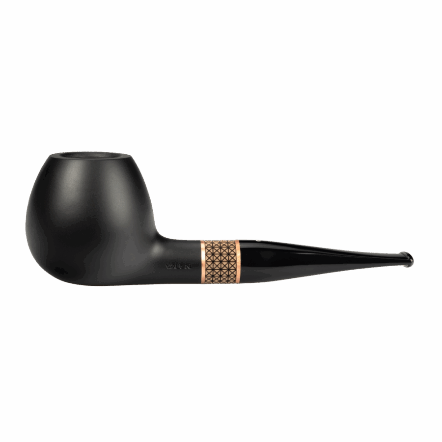 Schwarz matte Pfeife mit einem einzigartigen Holzring, der in unserer Manufaktur aus Walnussholz entsteht. Der filigrane Ring besitzt eine kunstvolle Lasergravur, die durch zwei Ringschalen aus Kupfer verstärkt und aufgewertet wird.