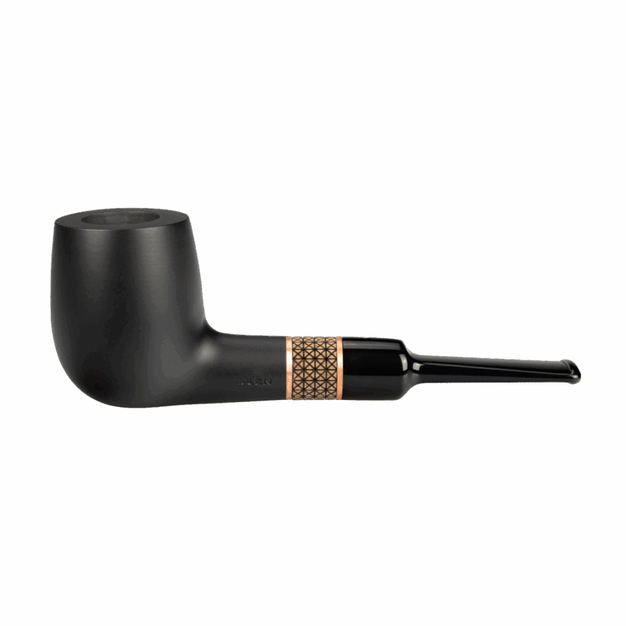 Schwarz matte Pfeife mit einem einzigartigen Holzring, der in unserer Manufaktur aus Walnussholz entsteht. Der filigrane Ring besitzt eine kunstvolle Lasergravur, die durch zwei Ringschalen aus Kupfer verstärkt und aufgewertet wird.