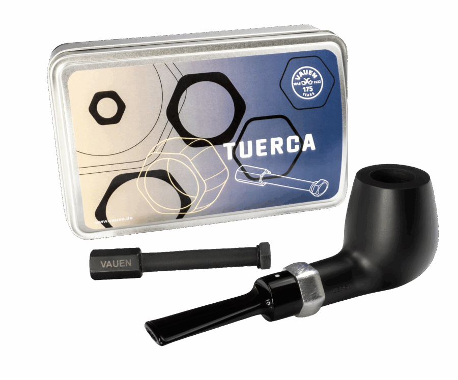 Im modernen und zeitlosen Industrial-Look präsentiert sich dieses Modell im Set mit Pfeife und Stopfer. Der Name "Tuerca" (spanisch für Mutter, als Gegenstück einer Schraube) steht für den dominanten Zierring am Holm. Der bewusst zurückgenommene Farbton bringt die zentrale Ringapplikation besonders gut zur Geltung.
