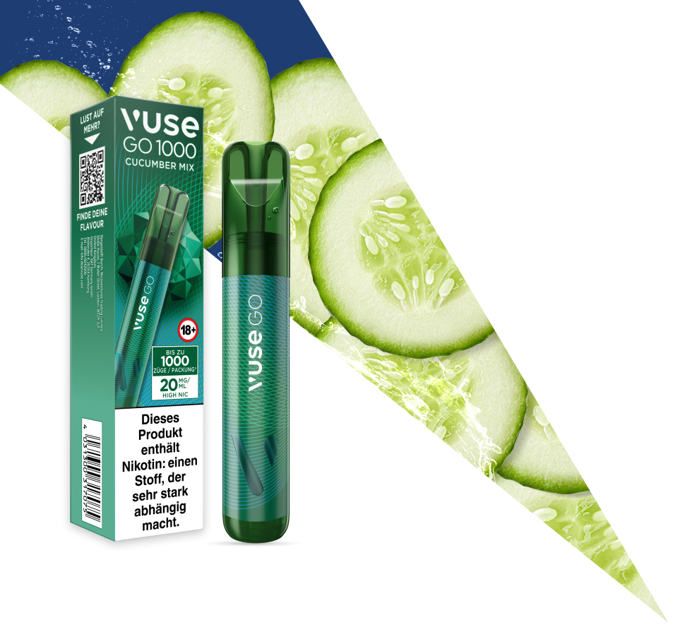 Verbesserte Technologie trifft auf längeren Genuss: Mit Vuse GO 1000 Cucumber Mix dampfst du jetzt bis zu 1000* Züge. Erfrischende Gurke trifft auf spritzige Cranberry – für eine belebende Geschmacksbalance.