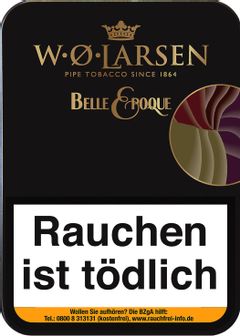 W.O. Larsen Belle Epoque ist ein aromatisch veredelter Premium-Pfeifentabak aus der dänischen Traditionsmarke W.O. Larsen (Scandinavian Tobacco Group), der ein harmonisches, fruchtig-süßes Rauchprofil mit exotischen Akzenten kombiniert. Der Name des Blends erinnert an die kulturell und genussorientiert elegante Epoche der Belle Époque, was sich im komplexen, stilvollen Geschmackserlebnis widerspiegelt.