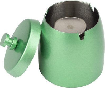 Kompakter Windaschenbecher aus Metall in der Farbe Grün. Der praktische Deckel schützt vor Wind und hilft, Asche sowie Gerüche zu reduzieren. Mit drei Zigarettenablagen – ideal für Balkon, Terrasse, Garten oder den Innenbereich.