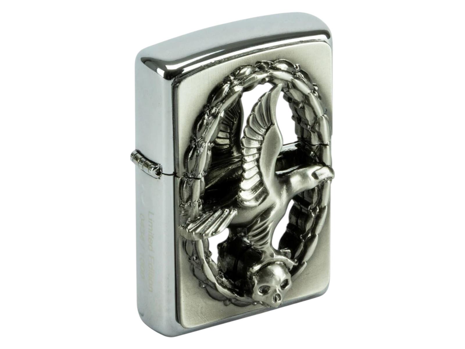 Ein limitierter Zippo‑Klassiker mit edlem Chrom‑Finish und plastischer Adler‑Plakette vor Spiegel‑Hintergrund – robust, nachfüllbar, windfest und mit legendärer Zippo‑Garantie.